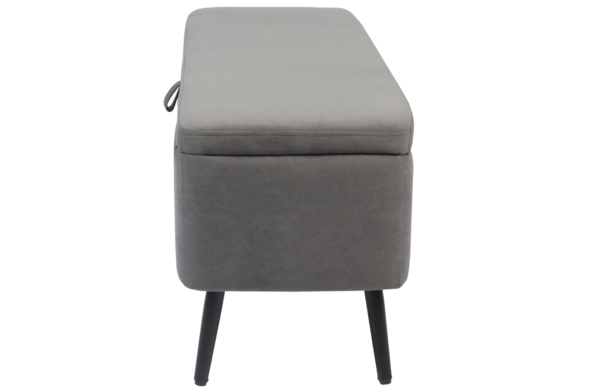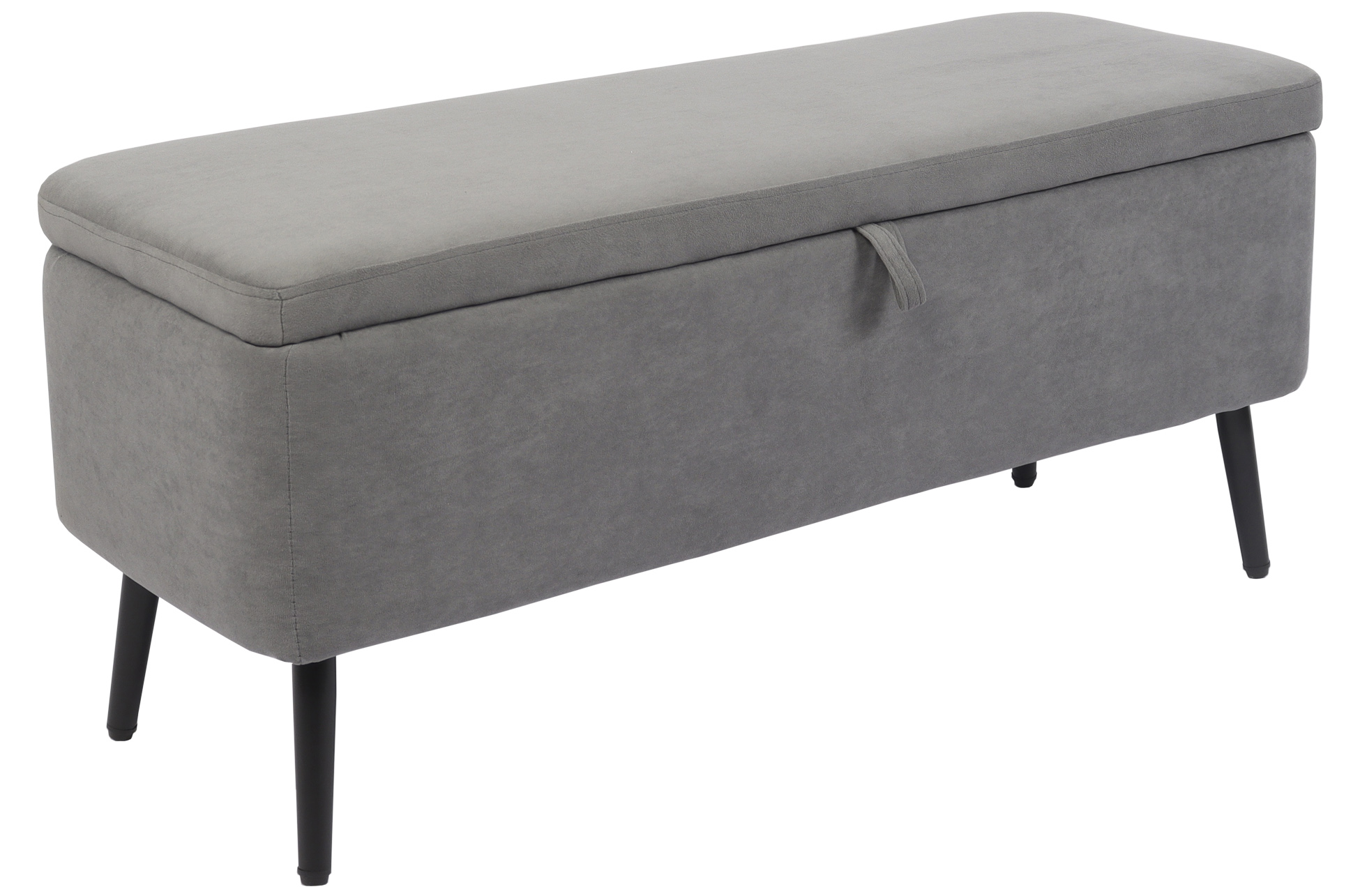 Baúl tapizado. Gran capacidad de almacenaje en su interior. Tejido microfibra gris. Patas metálicas color negro. Medidas: 110 x 40 x 49 cm.