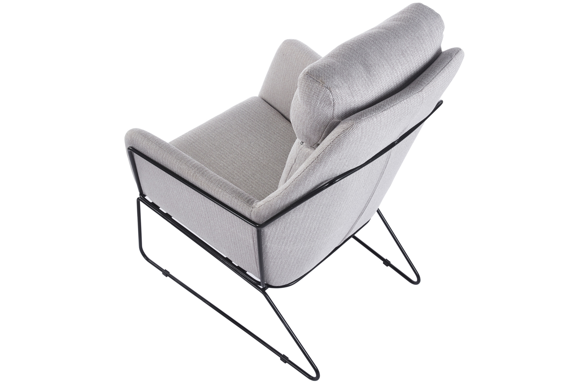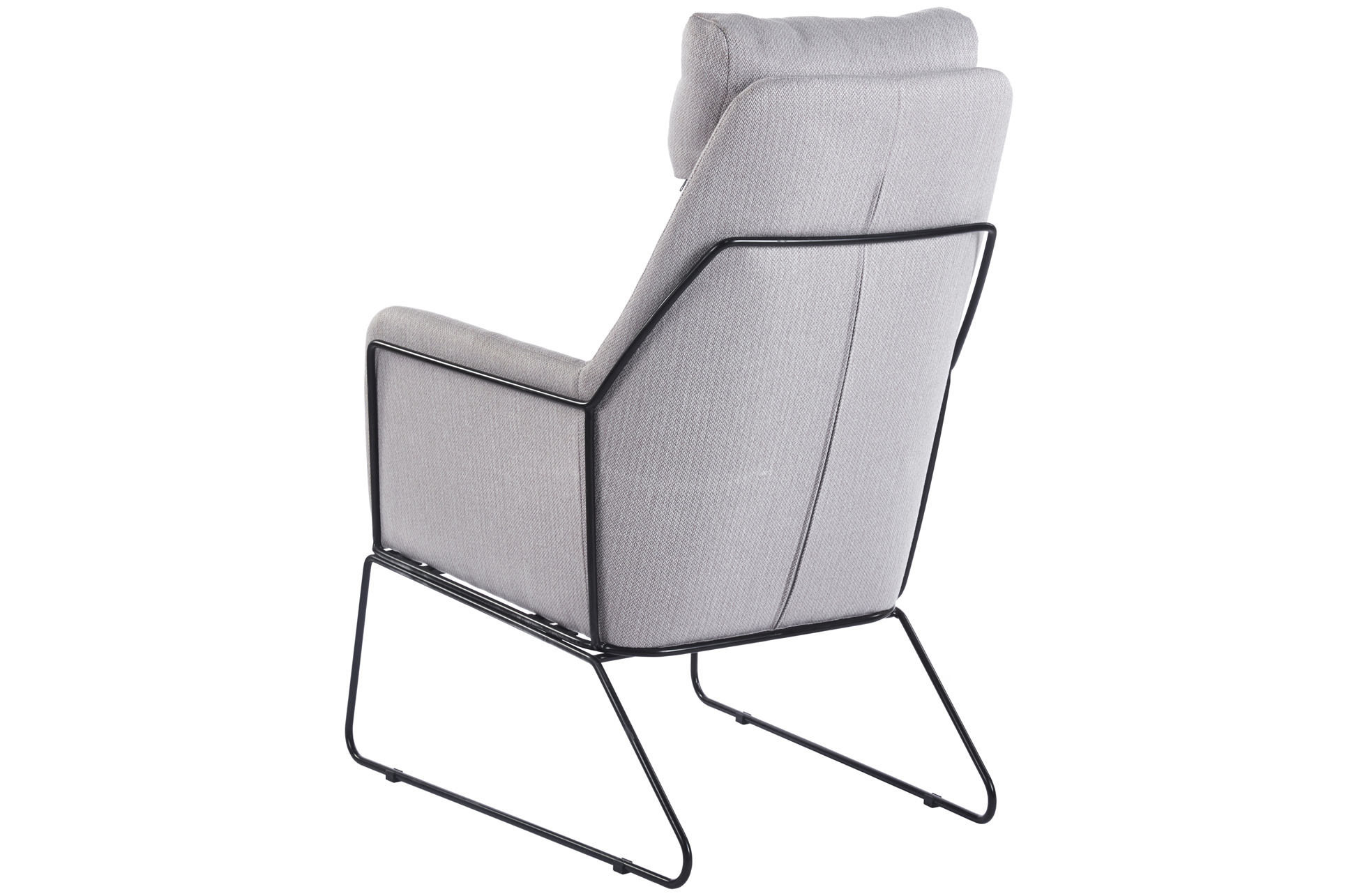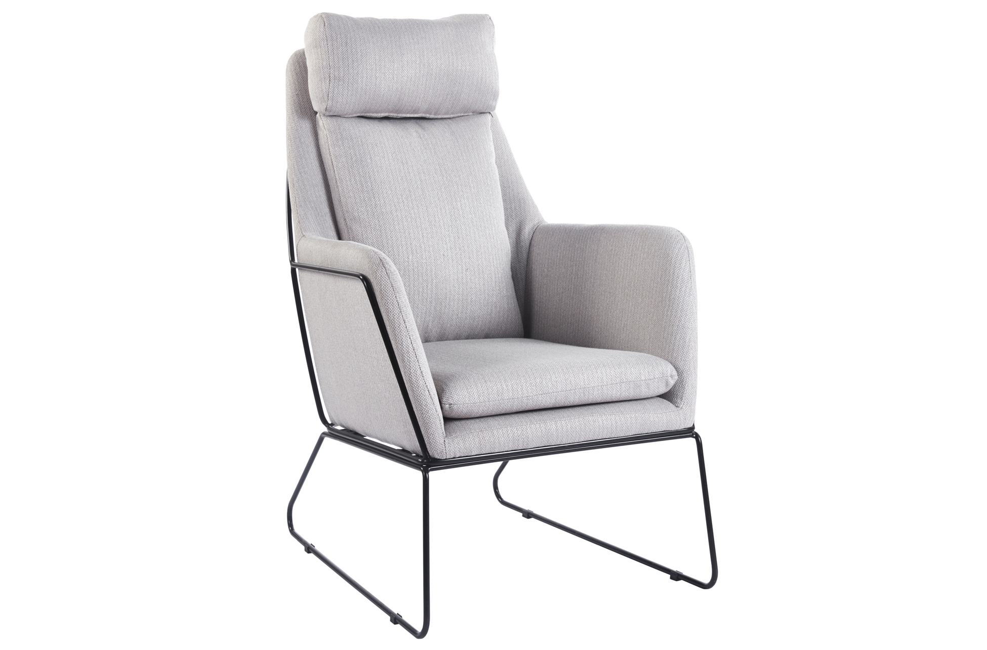 Butaca tapizada. Respaldo alto con reposacabezas. Estructura metálica color negro. Tejido beige. Medidas: 72 x 90 x 107 cm.