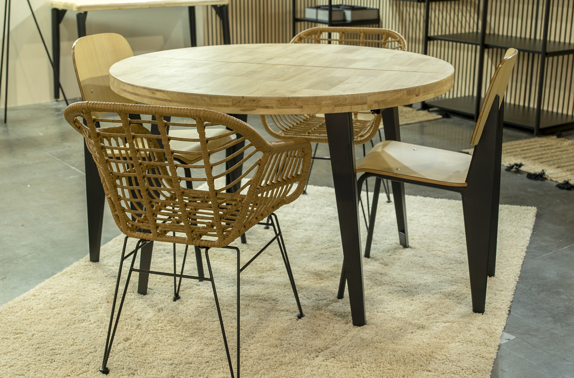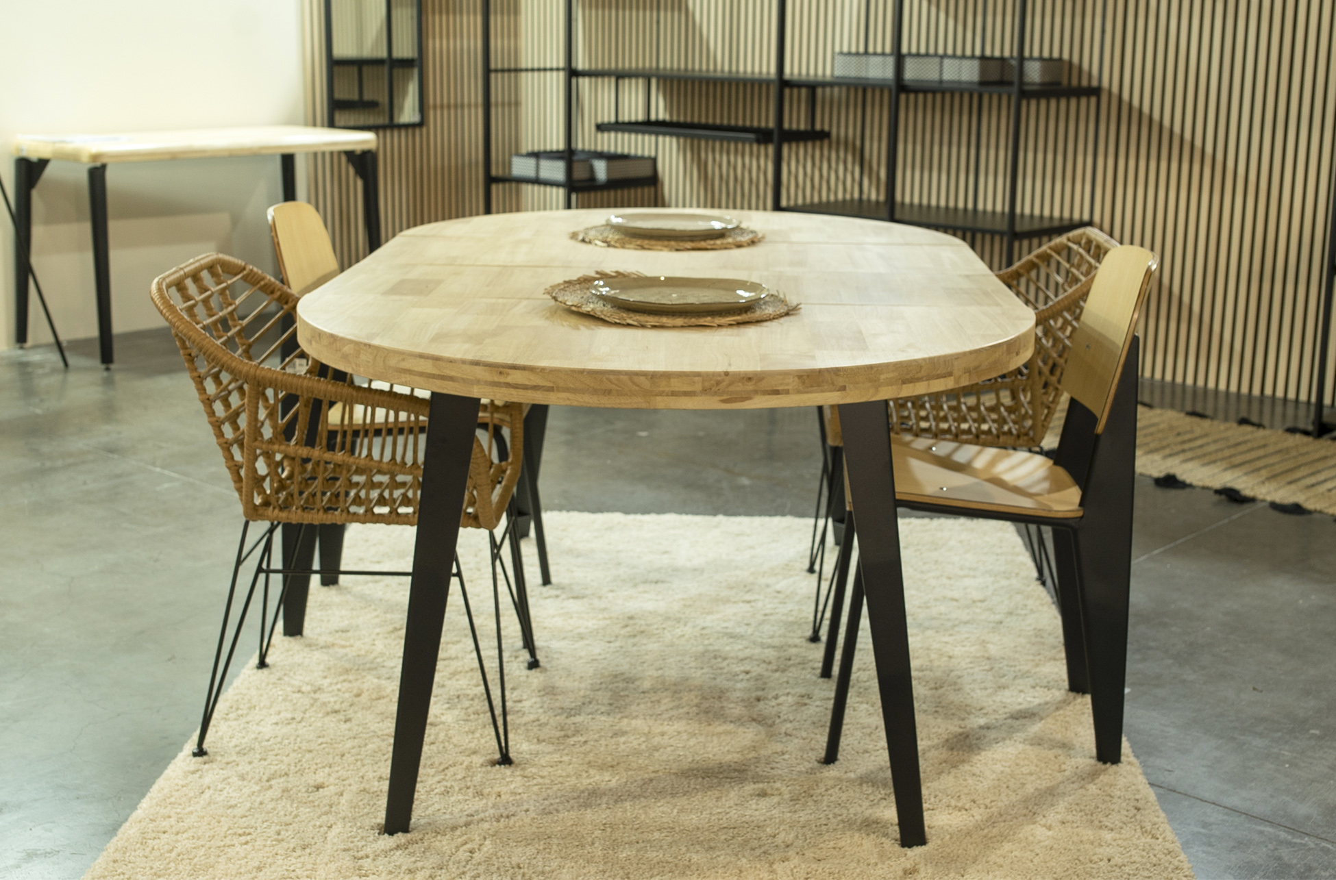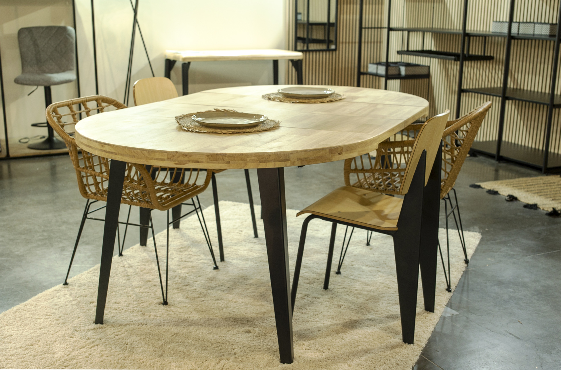Tapa extensible en madera de roble. Patas metálicas color negro. Extensible a 160 o 200 cm. Topes de suelo niveladores. Medidas: 120 – 160 – 200 x 120 x 76 cm.