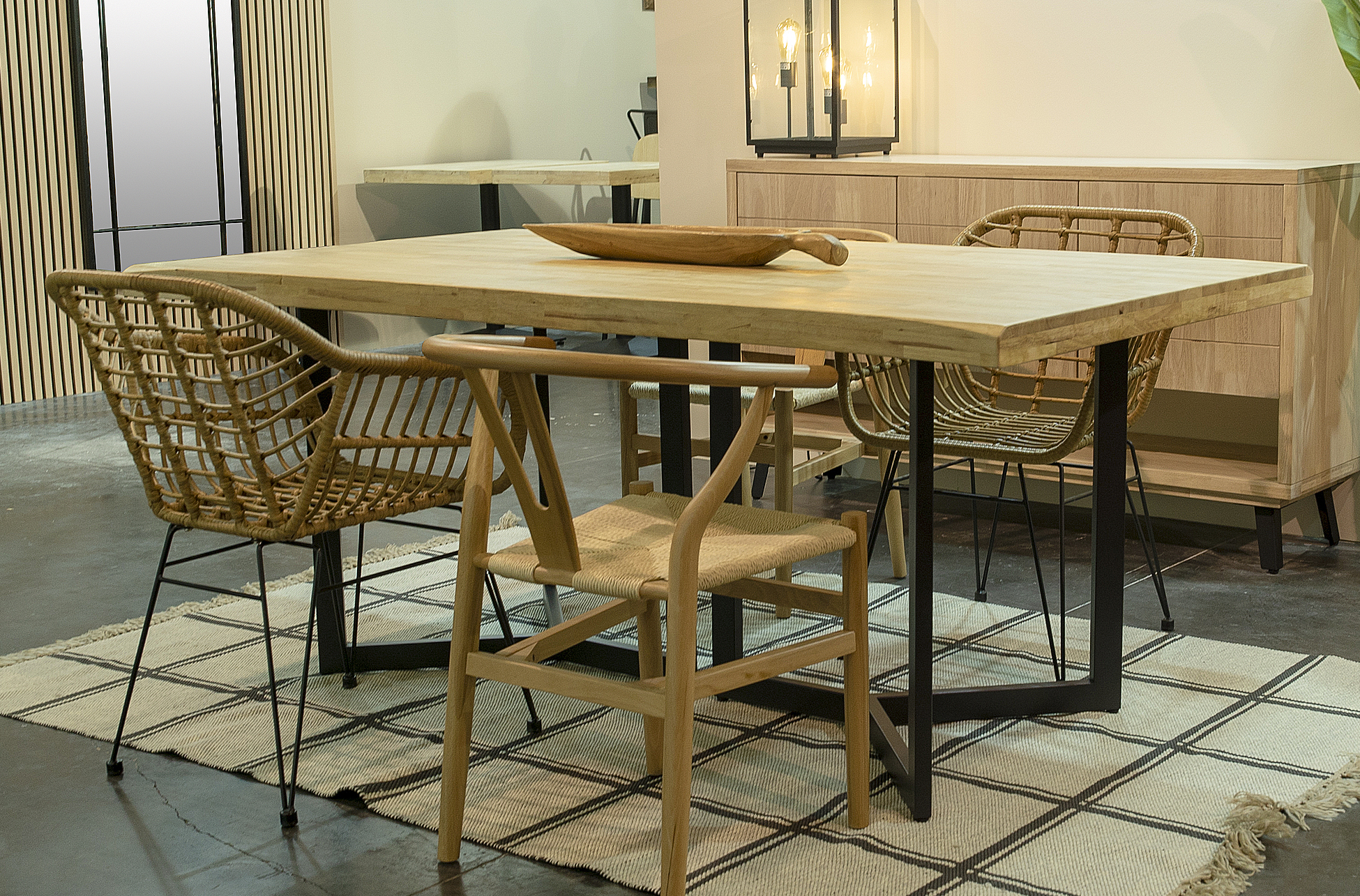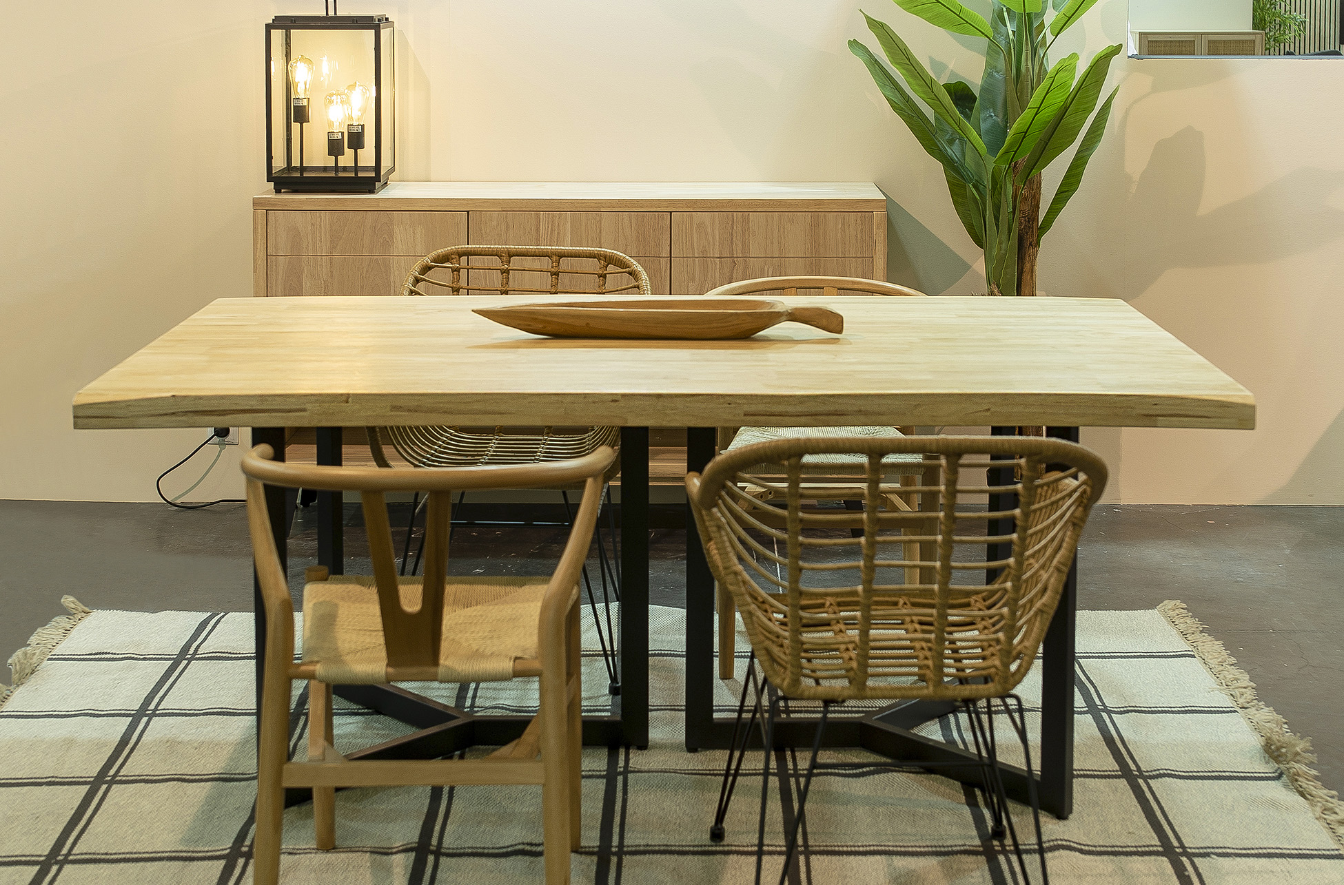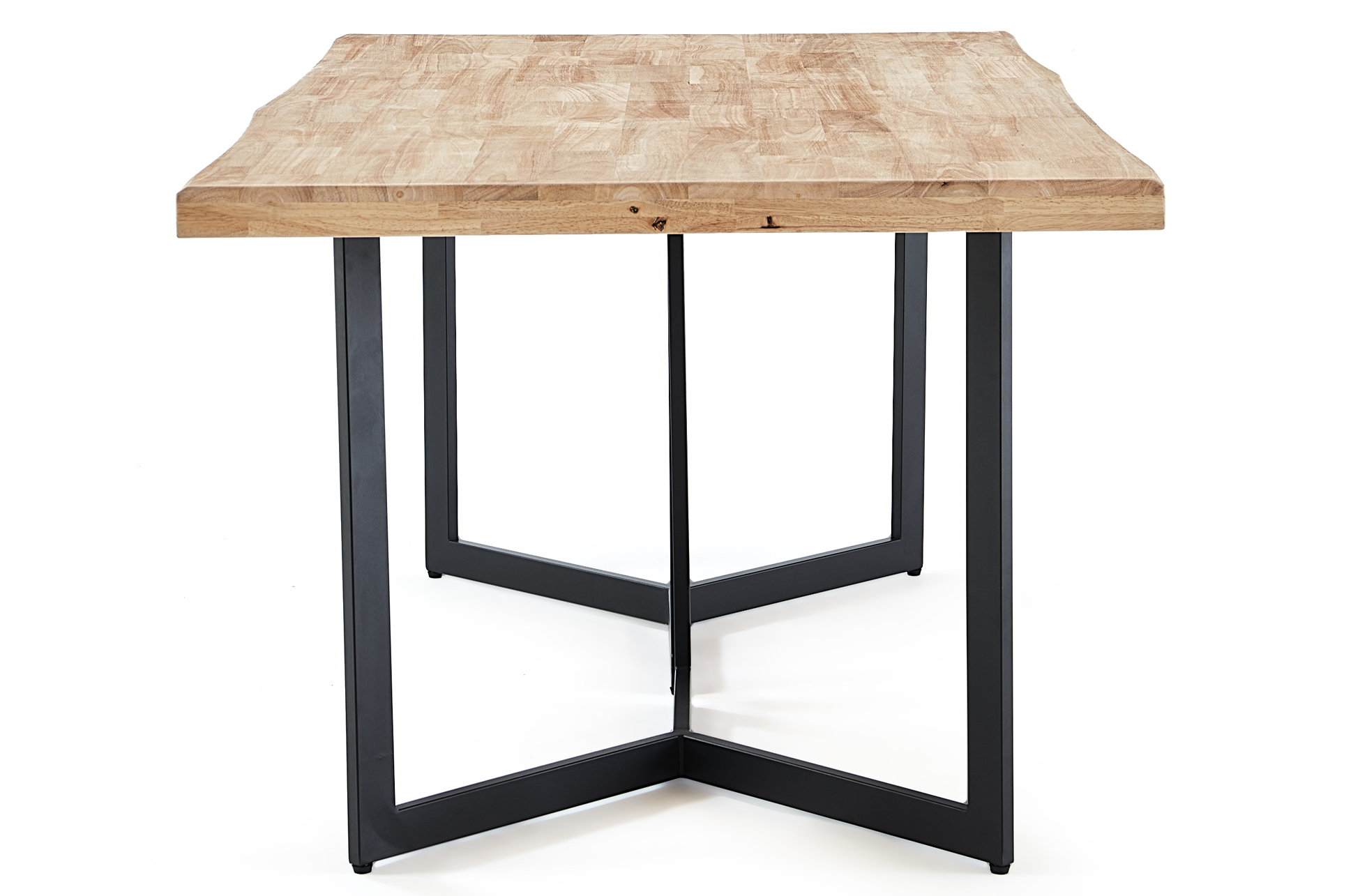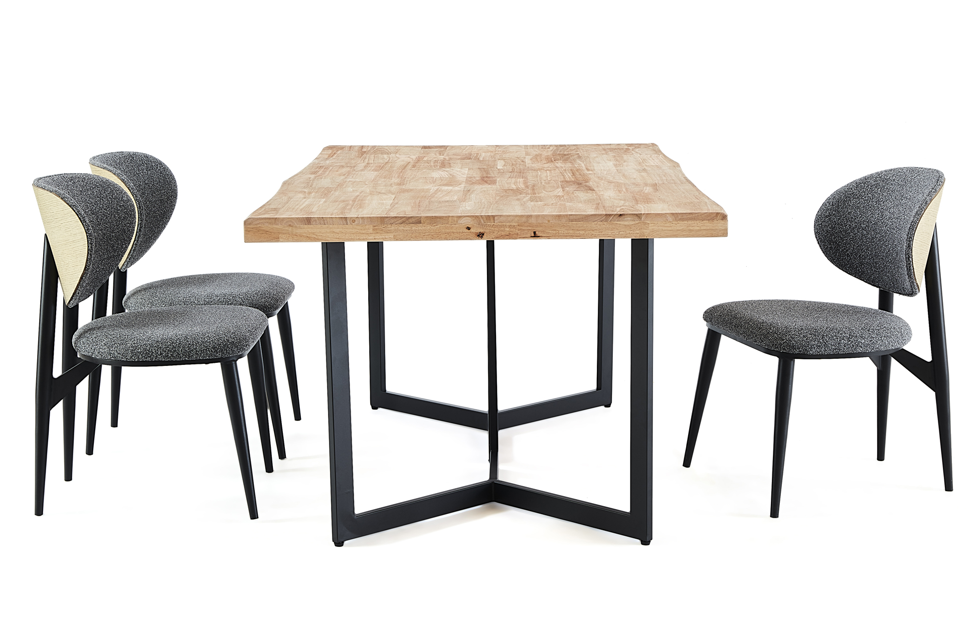 Tapa con formas en madera de roble. Patas metálicas 3 anclajes color negro. Topes de suelo niveladores. Medidas: 150 x 90 x 76 cm.