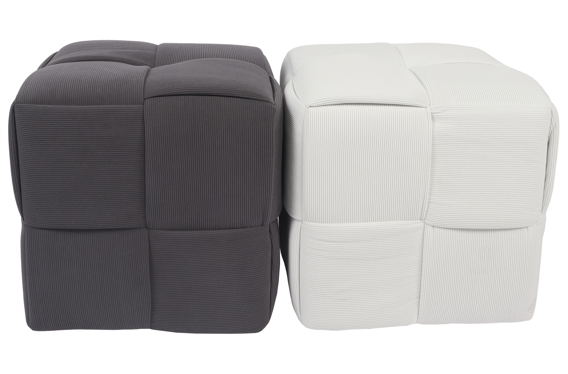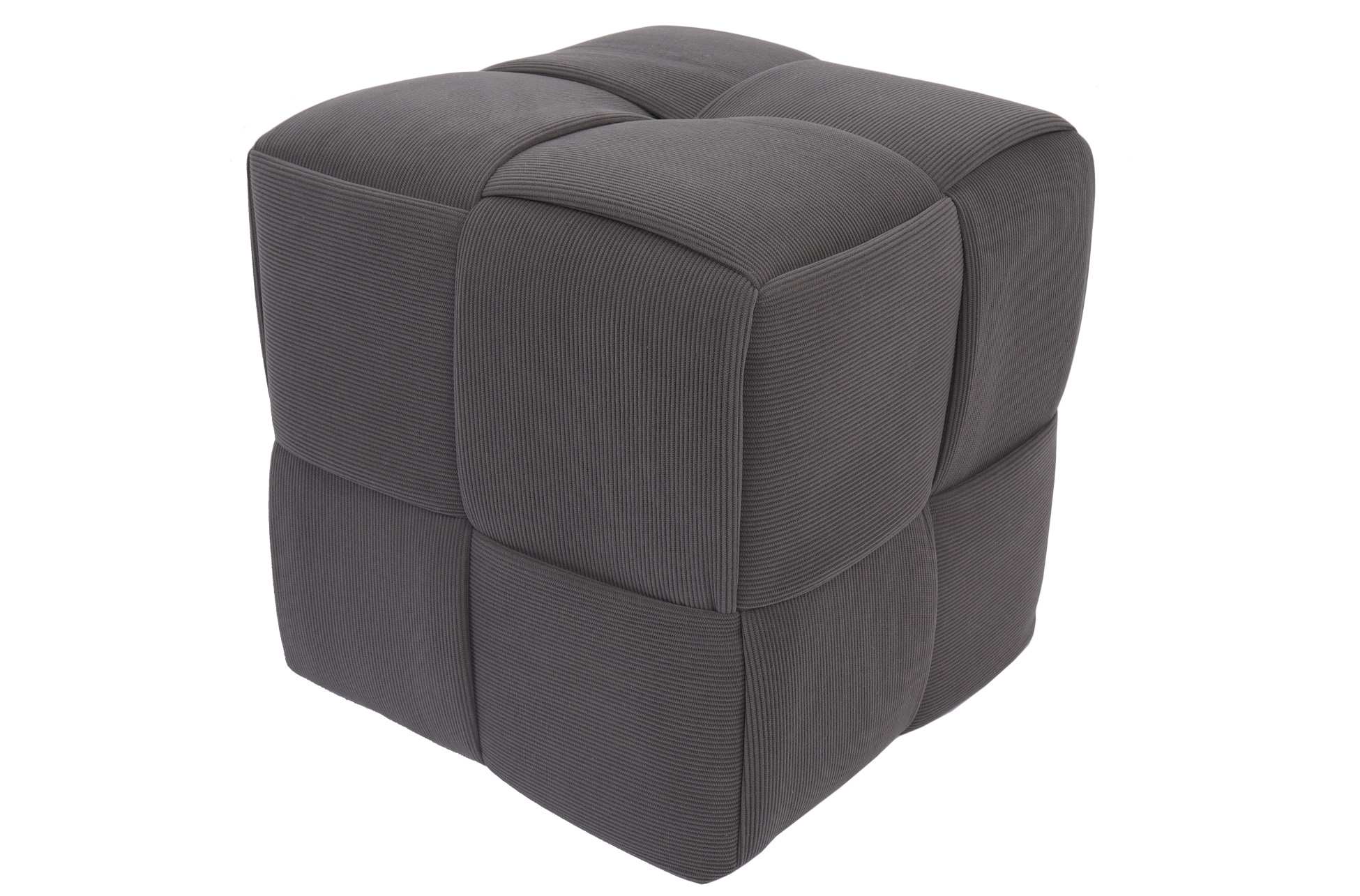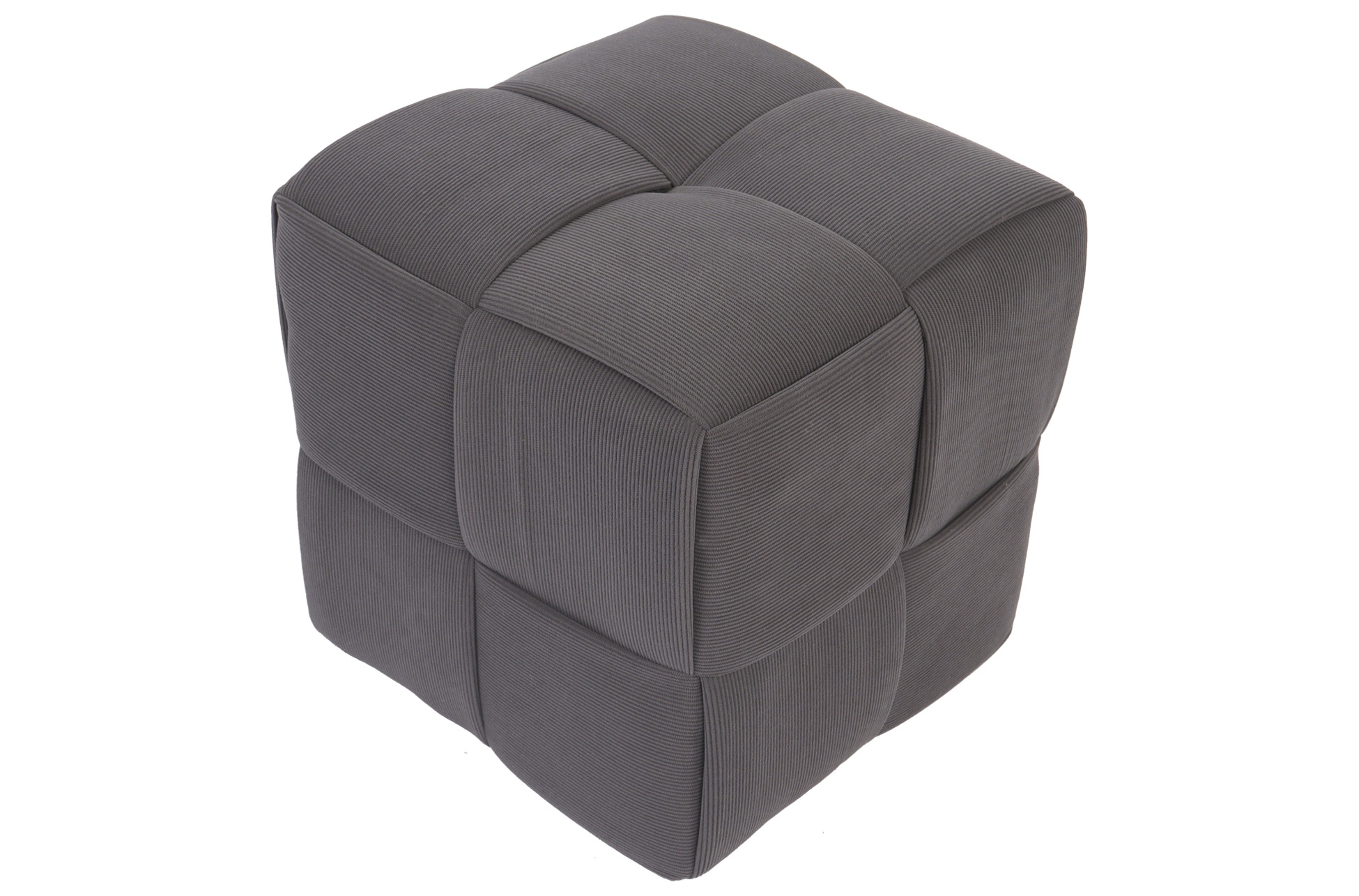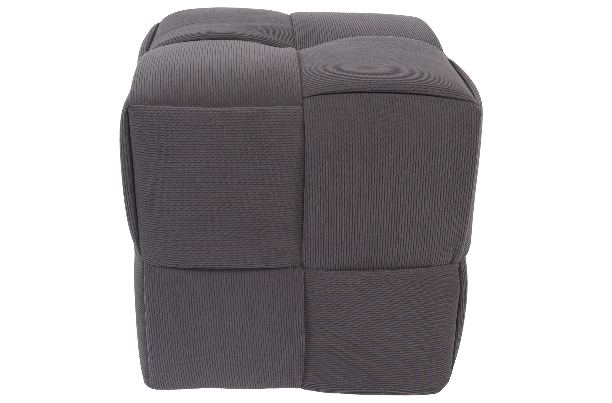 Puf cuadrado tapizado. Costuras decorativas con diseño a cuadros. Tejido Corduroy gris. Medidas: 45 x 45 x 41 cm.