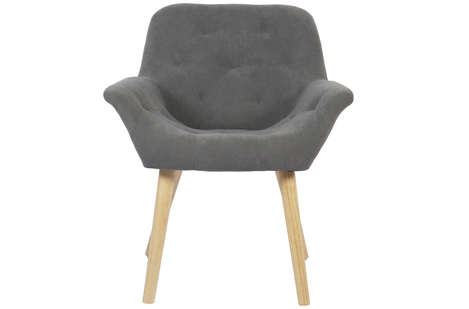 Silla comedor tapizada con apoyabrazos. Costuras decorativas. Patas en madera color natural. Tejido microfibra gris. Medidas: 67,5 x 64 x 82 cm.