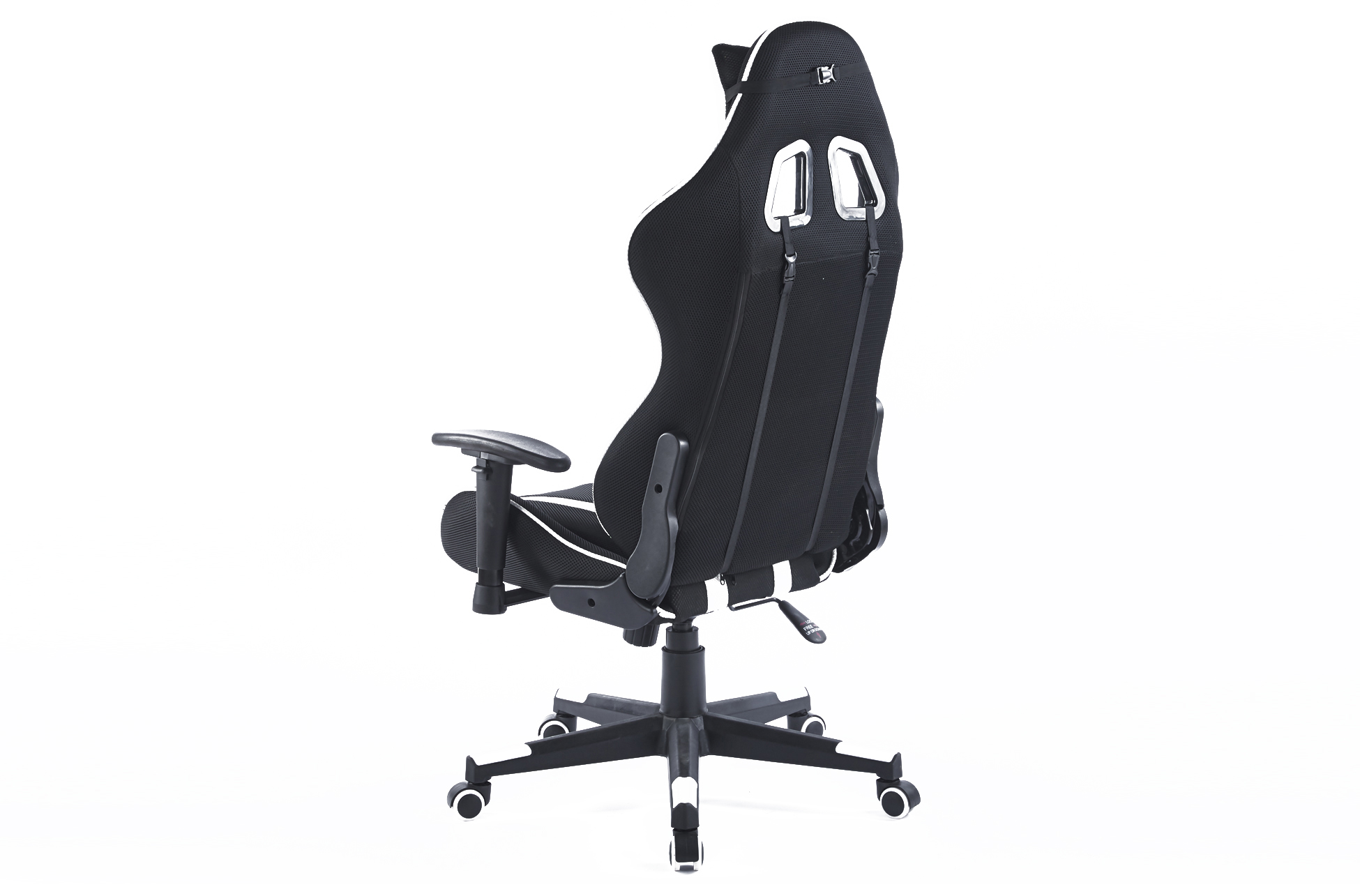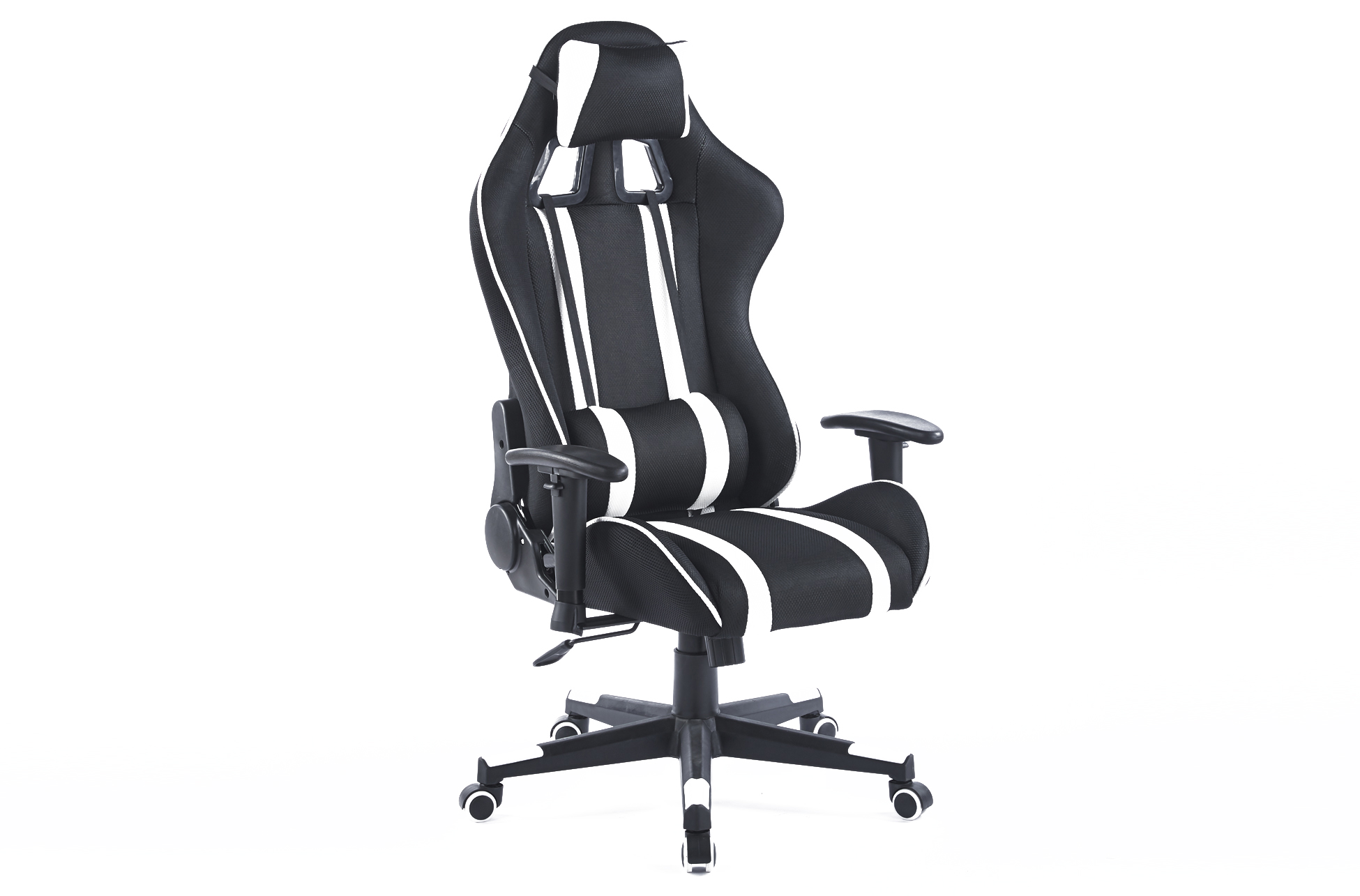 Sillón gaming giratorio. Altura regulable. Mecanismo basculante con bloqueo y regulador de tensión. Respaldo reclinable. Apoyabrazos regulables en altura. Cojín lumbar y cervical regulables incluidos. Ruedas blandas antirayas. Tejido red transpirable negro. Medidas: 70 x 70 x 121 – 131 cm.