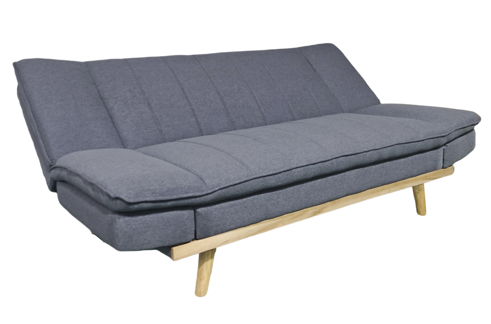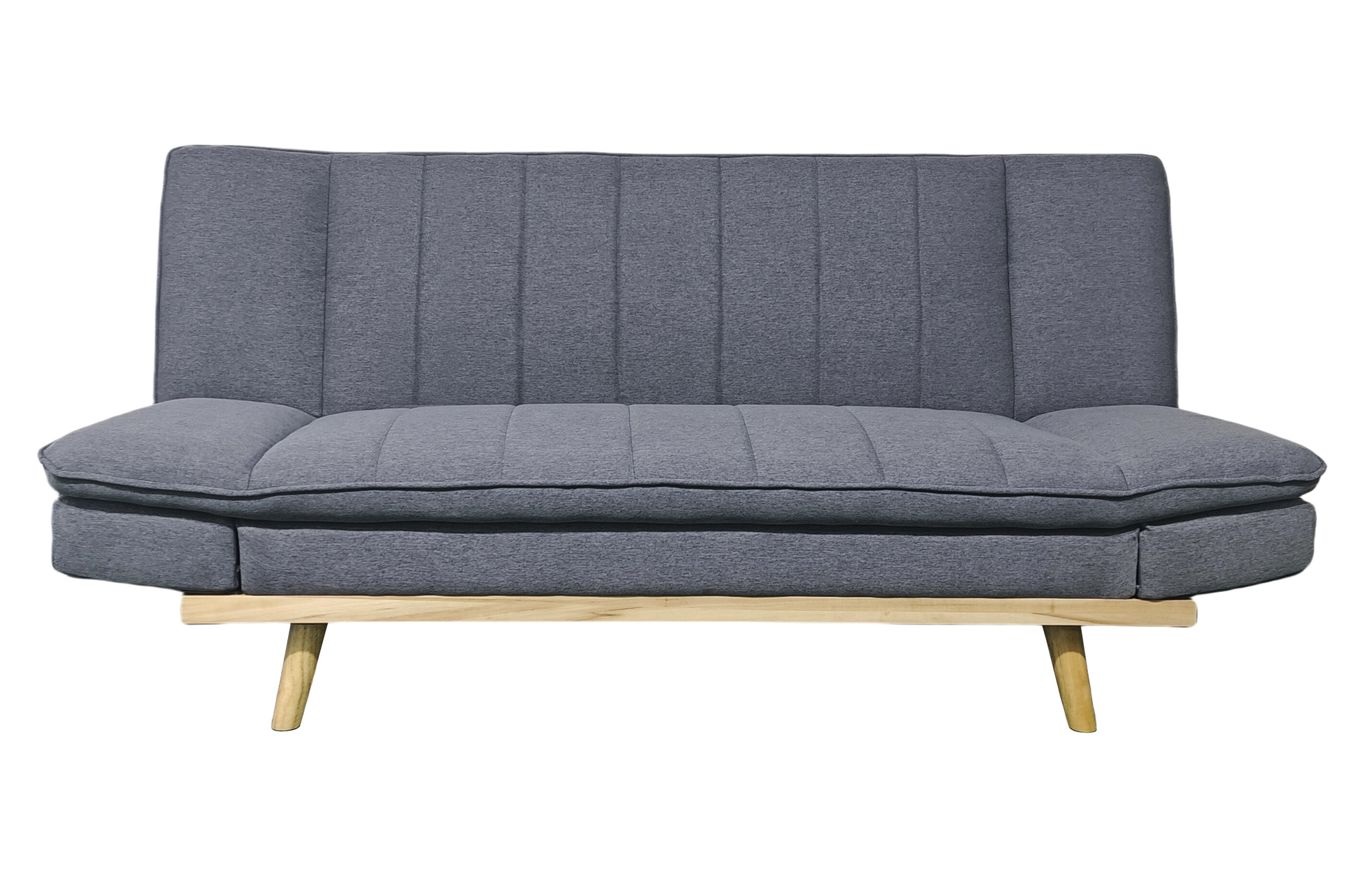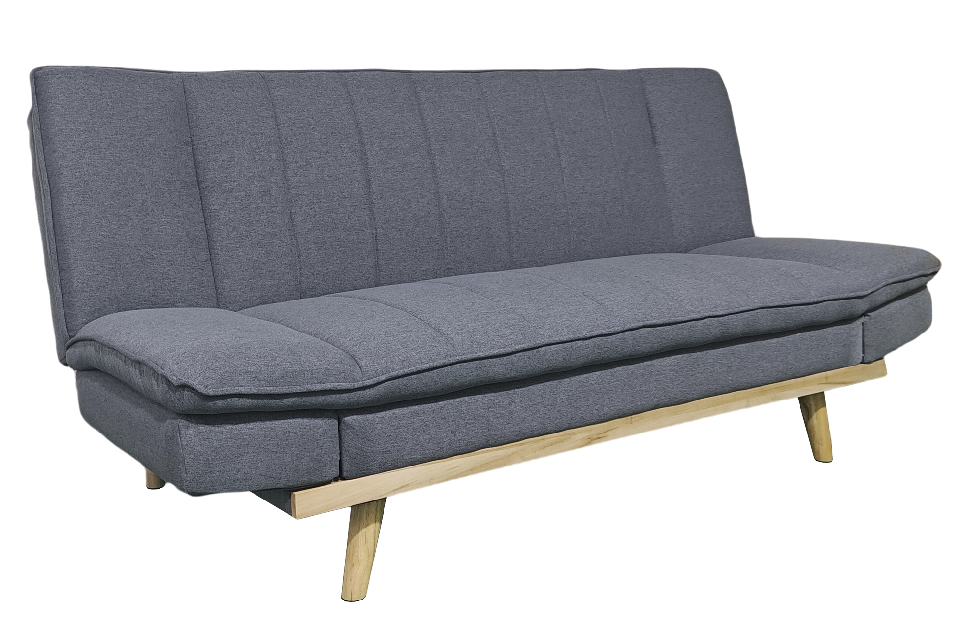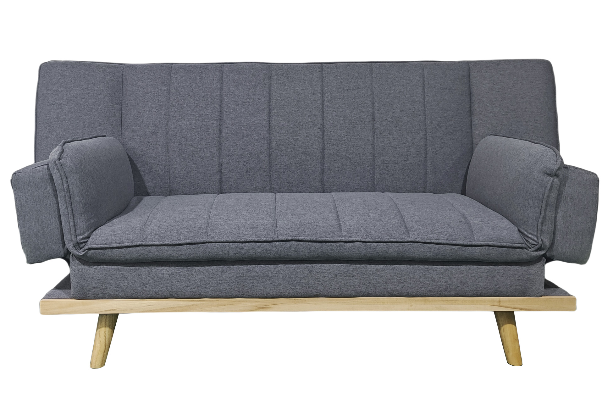 Sofá cama tapizado. Mecanismo clic clac con apertura tipo libro. Apoyabrazos reclinables y regulables en altura. Acolchado mullido soft confort. Costuras decorativas lineas verticales. Tejido gris. Base inferior y patas en madera maciza color natural. Medidas: 189 x 89 x 91 cm, cama 114 x 189 cm.